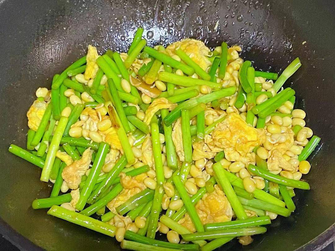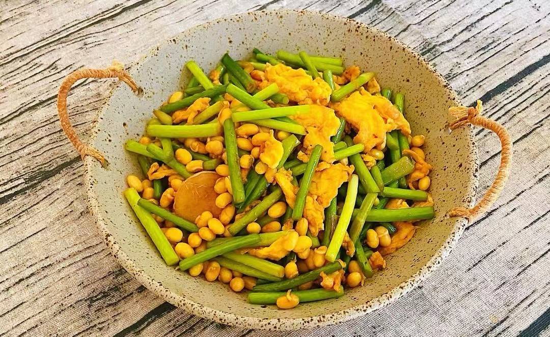 清明以后,当季的新鲜蒜苔开始上市了,一年中最好吃的时候,鲜甜可口,嚼起来也特别嫩,不像冬天的那种特塞牙。而其是大蒜的一种主要产物,富含硫化物,大蒜素,维他命C,纤维素,以及铁,硒,锌,磷等。帮助我们抗菌抗炎,清热排毒,清肝健脾,提升免疫等。而且它是一种非常下饭的菜,搭配黄豆,鸡蛋一起来炒,营养加倍,好吃又开胃。