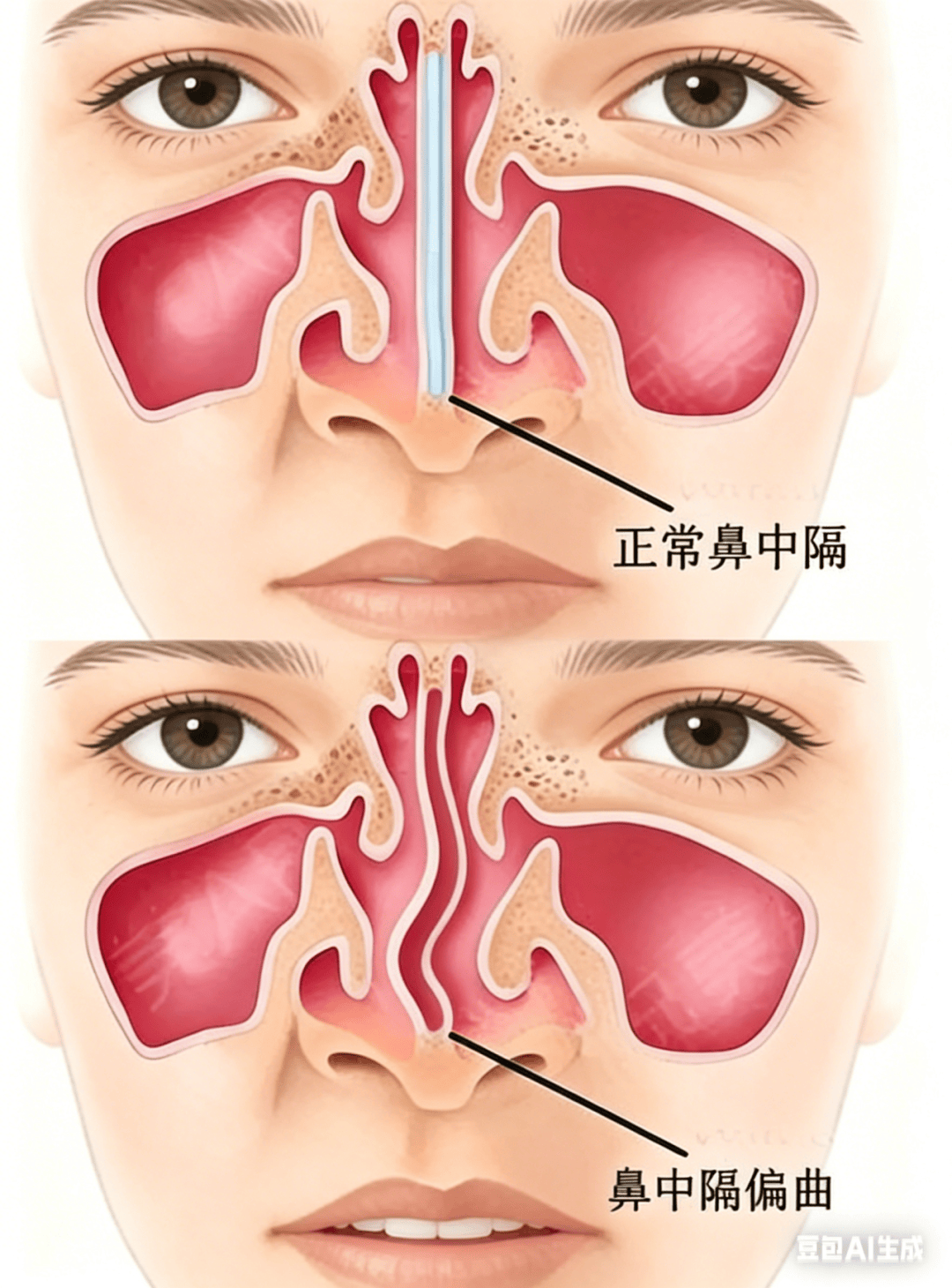 鼻中隔就像鼻腔内左右鼻孔间的“隔断墙”,由骨和软骨构成“墙体”,表面覆盖的鼻黏膜如同“墙纸”,分隔两个独立的通气通道,维持鼻部形态。曹平平解释说,“完全笔直的鼻中隔其实很少见。只有当它歪得比较厉害,导致鼻塞、反复流鼻血、头痛等问题时,才叫鼻中隔偏曲,需要治疗干预。”李先生就是一名典型的鼻中隔偏曲的患者,以前他两到三天就会流一次鼻血,需要随身携带抽纸。