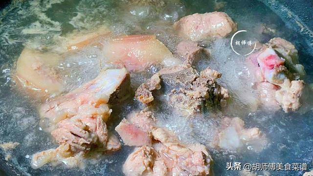 第二步:锅中放入适量冷水,然后将猪骨放入锅中,大火将猪骨焯水8分钟后捞出,接着再把猪骨表面的浮沫都冲洗干净。