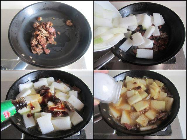 制作过程: 烧热锅放入适量的油,先将卤熟的牛肉块放进锅中煸炒两下,加入准备好的冬瓜片放进锅中翻炒几下,加入少许生抽和蚝油翻炒均匀,再加入适量的水炖煮, 炖煮至冬瓜微微透明后加入少许盐调味,翻炒均匀后大火收汁,盛入钵中撒上少许葱花即可。