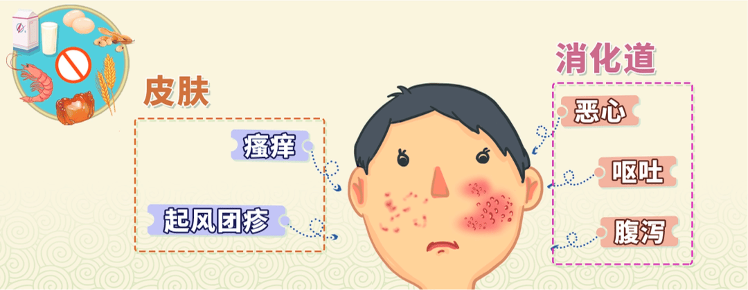 食物过敏的症状可累及全身各个器官和系统,其中最常见的是消化道和皮肤黏膜症状。不少人食用某些食物后,会出现嘴发麻、嗓子痒、舌头不适、皮肤瘙痒、起风团疹等症状,还可能伴随恶心、呕吐、腹泻等消化道不适。