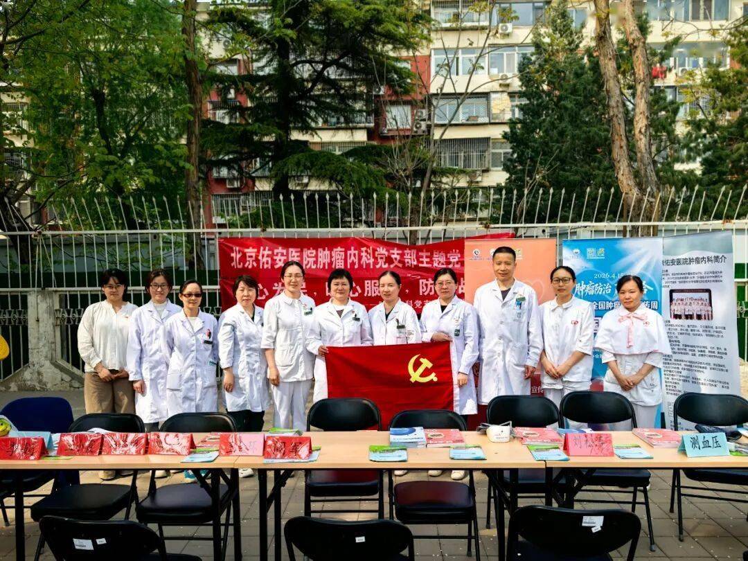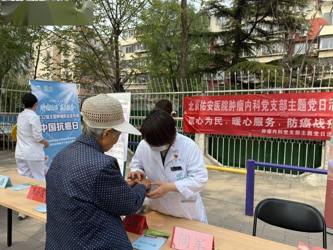 2026 年4月15日至21日是第32届全国肿瘤防治宣传周,主题为 “早防早筛早治 同心携手抗癌”。4月15日全国抗癌日当天,北京佑安医院肿瘤内科党支部书记闾军带领党支部党员、积极分子、医疗骨干走进丰台区玉林西里社区开展大型肿瘤防治义诊志愿服务,充分发挥党支部战斗堡垒作用与党员先锋模范作用,把优质医疗服务送到群众家门口。
